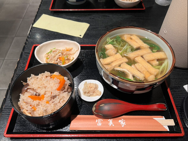 The udon noodles are made with Kyoto-style dashi broth, which is gentle on the body and has a relaxing taste.