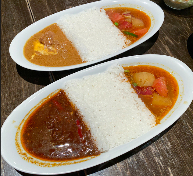 The combination system is to choose one of the vegetable curry and one of the other three types of curry. 3 types of curry are also available with a small portion of curry only, so you can enjoy all types of curry.