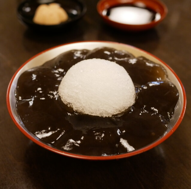 When you open the lid, you will see a black bowl filled with molasses and kuzukiri floating in ice water.