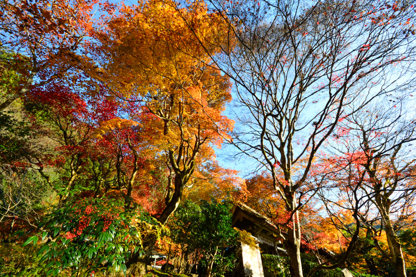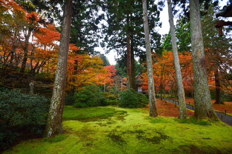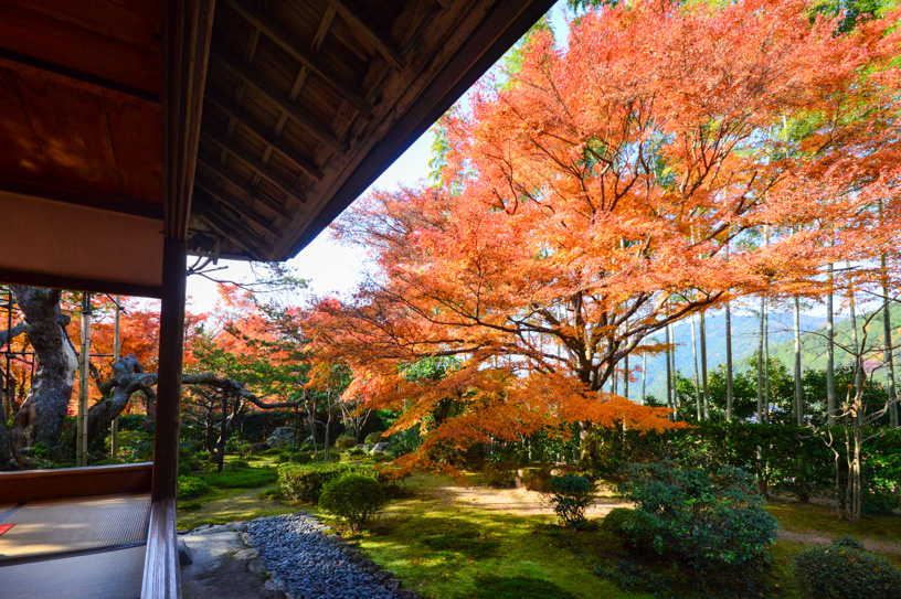 During the autumn foliage season, when the trees are beautifully colored, Sanzen-in Temple is crowded, including the approach to the temple, but if you go a little further back in front of Sanzen-in Temple, the flow of people becomes quieter, and the temple is dotted with temples with unique characteristics. One of these temples, Jikkoin, has a serene garden where you can see the Fudan-zakura (non-flowering cherry blossoms) that bloom from fall to spring.